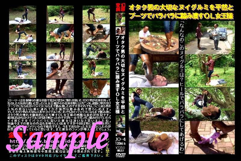 今回のOL女王様編は急遽前日撮影が決まったのでとにかく彼女が好きな様にやってもらいました。すでに彼女の踏みや踏み潰し言葉責めは完璧で私なんぞはなにも言うことはありません。ストーリーは仕事帰りの彼女を街で見かけ密かに憧れを抱いたオタク男が花束を持って告白したら気持ち悪いと怒ったOL女王様がその花束を取り上げビンタし道路に叩き付けブーツで花がバラバラになるまで踏み潰したのですがそれでもしつこく迫る男を人気の居ない山奥に連れて行き強烈な踏み責めで懲らしめます。そしてオタク男の大切な人形やヌイグルミをこれでもかとバラバラになるまで踏み潰しオタク男の憧れを徹底的にぶち壊すOL女王様の残酷な責めが炸裂です。最初はなかなかヌイグルミが裂けなかったのですがヒールでガンガン踏み付けていたらイイ感じで全てバラバラに裂いた彼女は凄いなと思いましたね。勿論今までの彼女の作品も素晴らしい出来ですが今回は特に彼女が自然に楽しみながらイジメテいるので最高ですよ、今まで出なかった方言を口にしたのが自然さを物語っていると思います、また彼女のファンが増えることでしょう。 ※本編顔出し