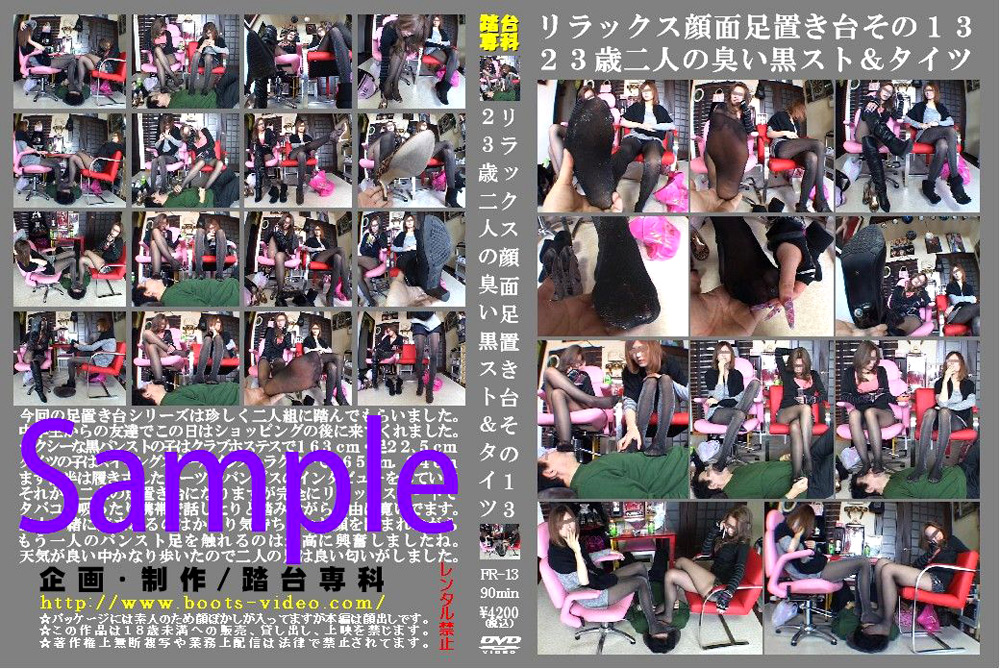 今回の足置き台シリーズは珍しく二人組に踏んでもらいました。中○生からの友達でこの日はショッピングの後に来てくれました。セクシーな黒パンストの子はクラブホステスで163cm・足22.5cm。タイツの子はスイミングスクールインストラクターで165cm・24cm。まず前半は履き古したブーツやパンプスのインタビューをして、それから二人の足置き台になりますが完全にリラックスモードでタバコを吸ったり携帯で話したりと踏みながら自由に寛いでます。二人一緒に踏まれるのはかなり気持ち良いし顔を踏まれながらもう一人のパンスト足を触れるのは最高に興奮しましたね。天気が良い中かなり歩いたので二人の足は良い匂いがしました。 ※本編顔出し